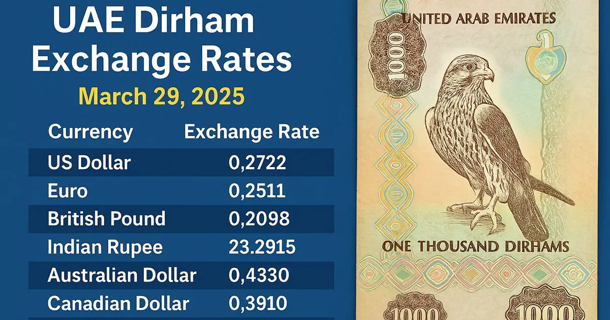 As of March 29, 2025, the United Arab Emirates (UAE) Dirham (AED) maintains a stable exchange rate against major currencies. The Central Bank of the UAE last updated its exchange rates on March 27, 2025.